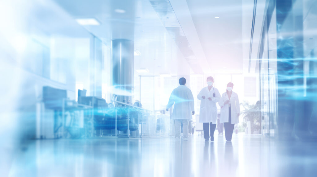 Long hospital bright corridor with rooms and blue seats.