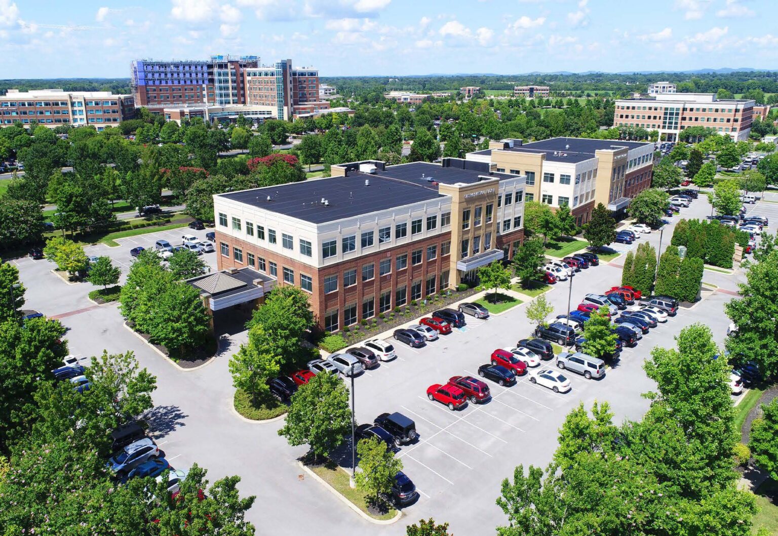 MOB on hospital campus.Medical office building with retail space housing a Walgreens.Front entrance of a five story MOB.